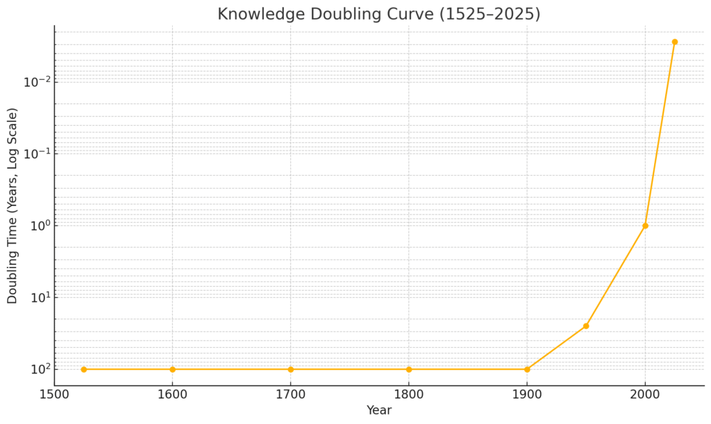 Before the year 1900, knowledge was doubling once per century (hence the fairly flat line between 1525 and 1900).